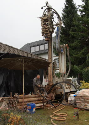 Bohrturm im Vorgarten eines Einfamilienhauses