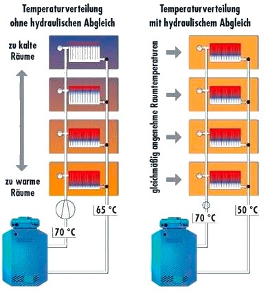 Der hydraulische Abgleich von Heizungsanlagen ist dabei von entscheidender Bedeutung. Darunter versteht man die fachgerechte Einregulierung der Heizungsanlage. Mit Hilfe von voreinstellbaren Thermostatventilen erhalten die Heizkörper nur die Wassermengen, die notwendig sind, um die Wohnräume mit ausreichend Wärme zu versorgen.