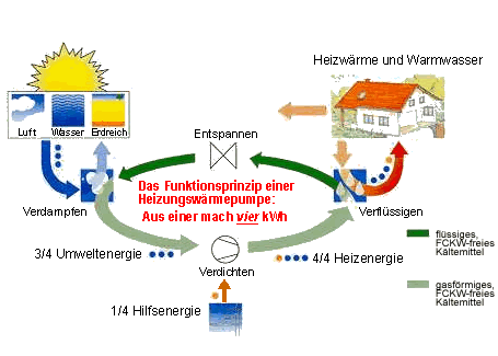 Die Wärmepumpe entzieht unserer Umwelt aus der Luft, der Erde oder dem Wasser Wärme. Diese gewonnene Wärme wird im Gerät aufbereitet und an das Heizungswasser weitergegeben. Selbst wenn draußen klirrende Kälte herrscht, holt die Wärmepumpe noch so viel Wärme, wie sie zum Beheizen eines Hauses benötigt.